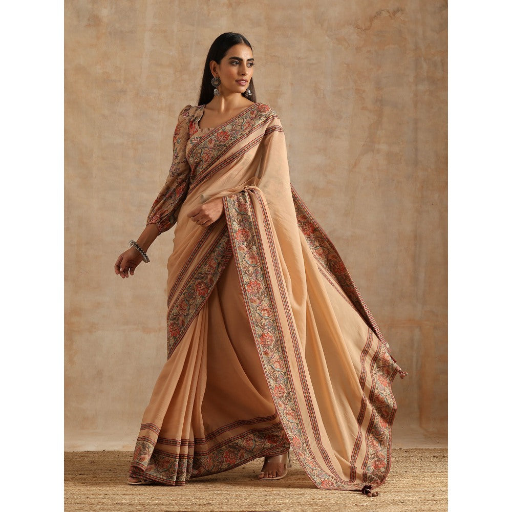 Description : Beige Organza Saree with Digital Printed Border Paired with Jaal Printed Muslin Blouse