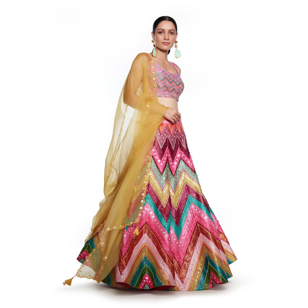 Siddhartha Bansal Signature Pink Chevron Embroidered Lehenga with Blouse & Dupatta (Set of 3)
