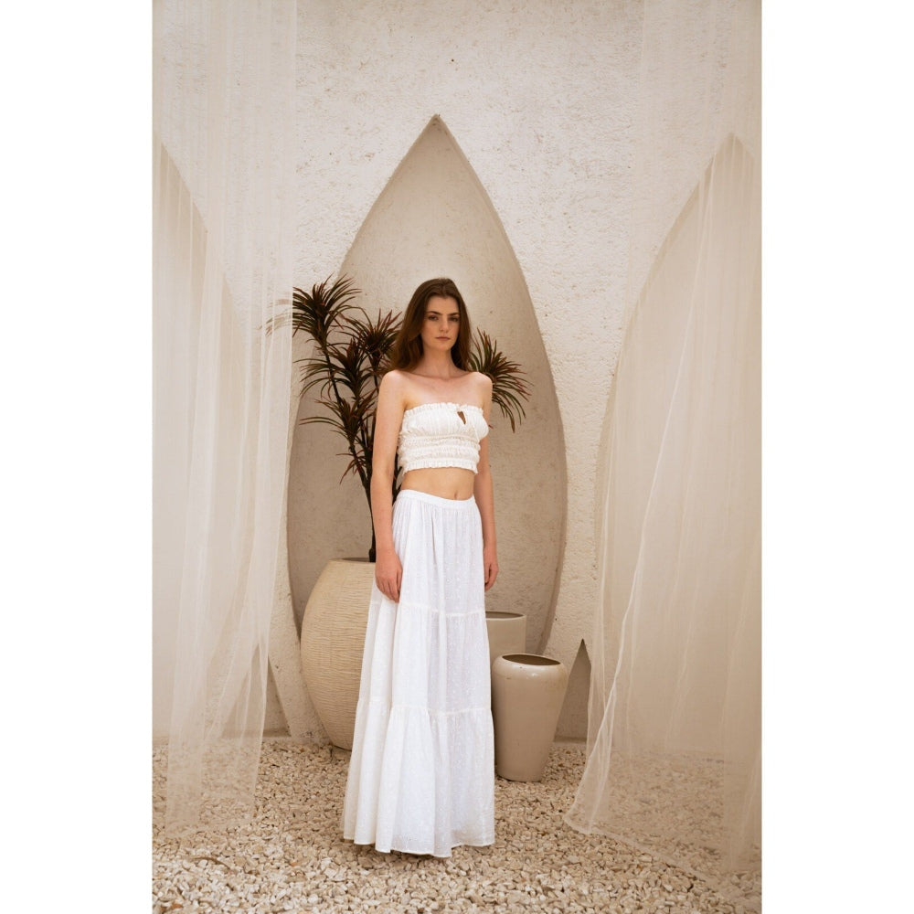 Description : Make A Feminine Statement With Our Dreamy White Skirt Set, Featuring An Elasticated Strapless Top And A Tiered Skirt In Exquisite Schiffli Fabric. This Design Adds A Touch Of Whimsy And Romance.