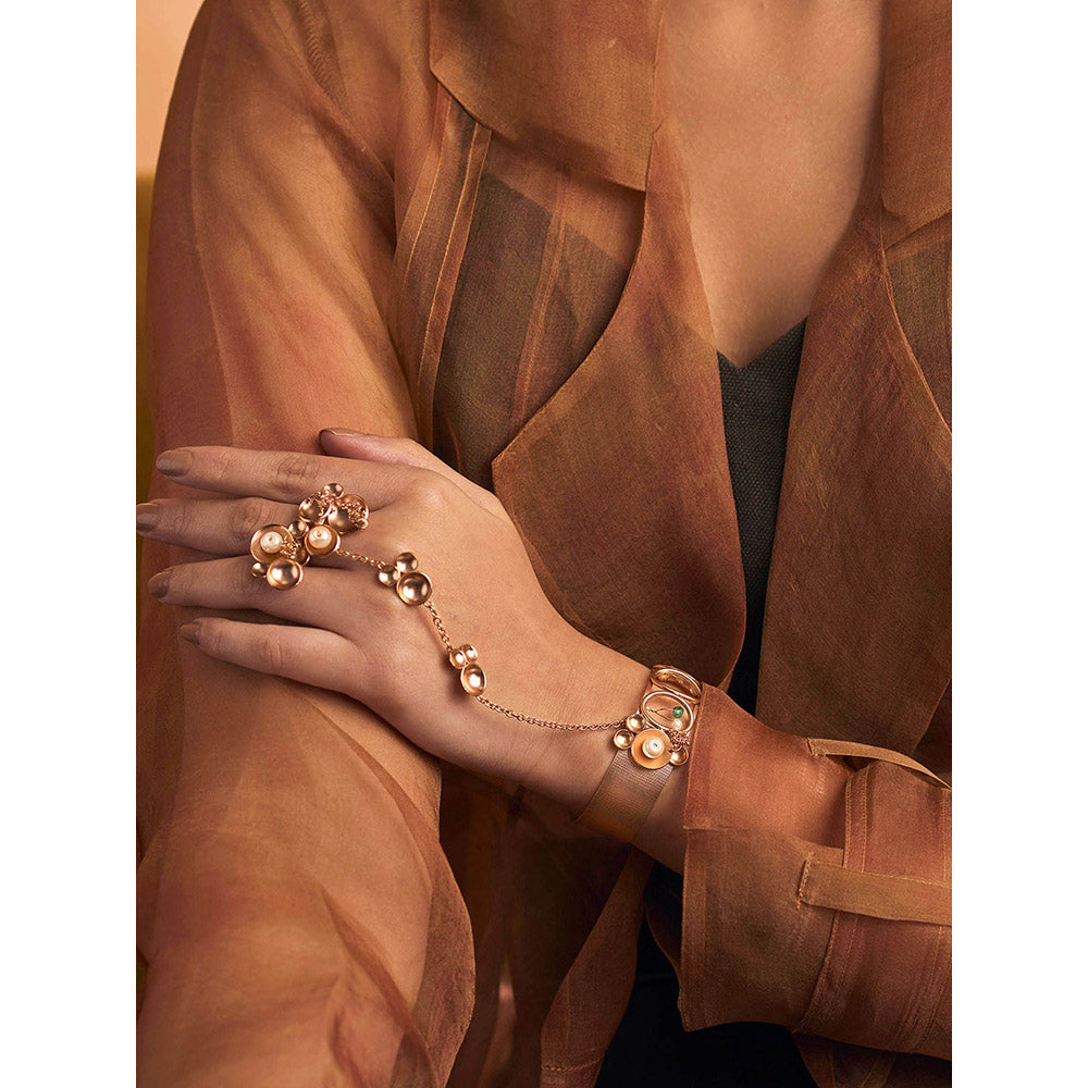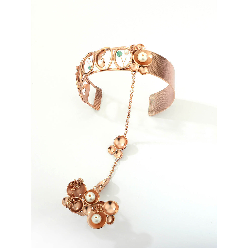 Description : A floral patterned ring and cuff, connected by a fine chain, inspired this superb hand accessory. Inspired by the sudden blooms in spring, are its embellishments with pearls and fine emeralds.