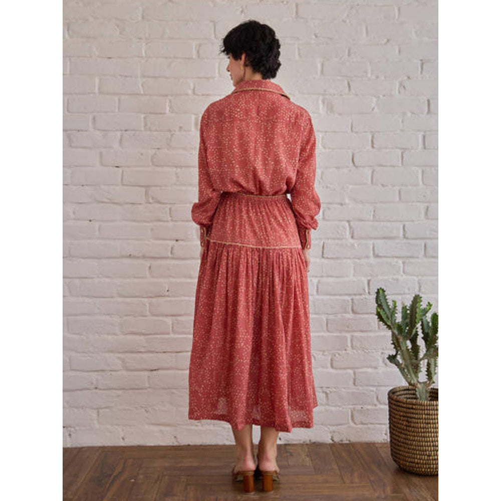 Description : The Rose Meadow Shirt is a playful yet refined staple with a vintage twist. Made in soft cotton mul and adorned with a delicate all-over dotted print, it features functional patch pockets, contrast piping, and a buttoned front. Pair it with high-waisted trousers or a relaxed skirt for an effortless day-to-evening look.