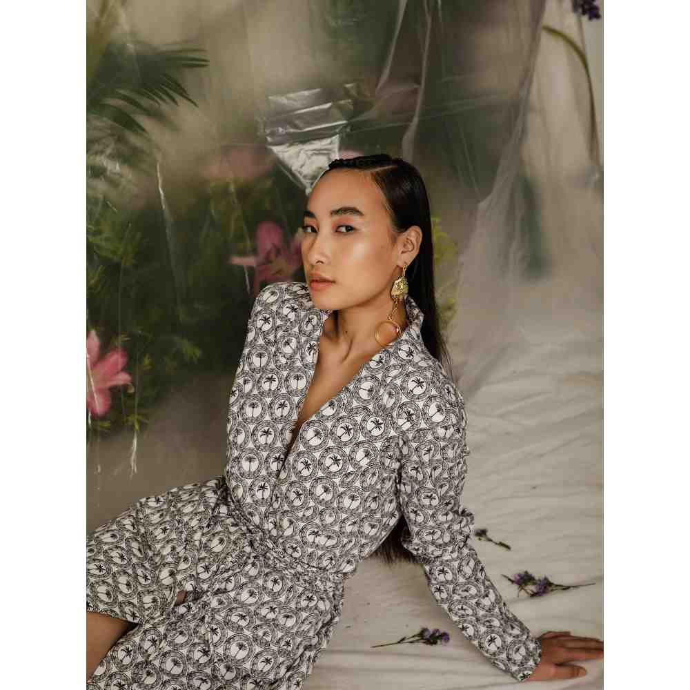 Description : This black and white toyo jacket is inspired by the palm trees on the beach. It is made in poplin fabric and detailed with self cotton printed lining. Featuring this super chic long jacket with braided belt. Tailored to sartorial perfection from premium quality fabric, it assures a soft and soothing touch against the skin. The exquisite silhouette adds to its appeal.