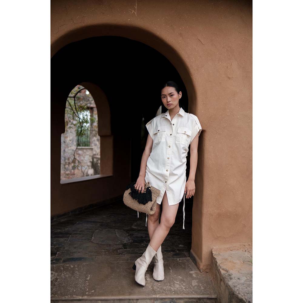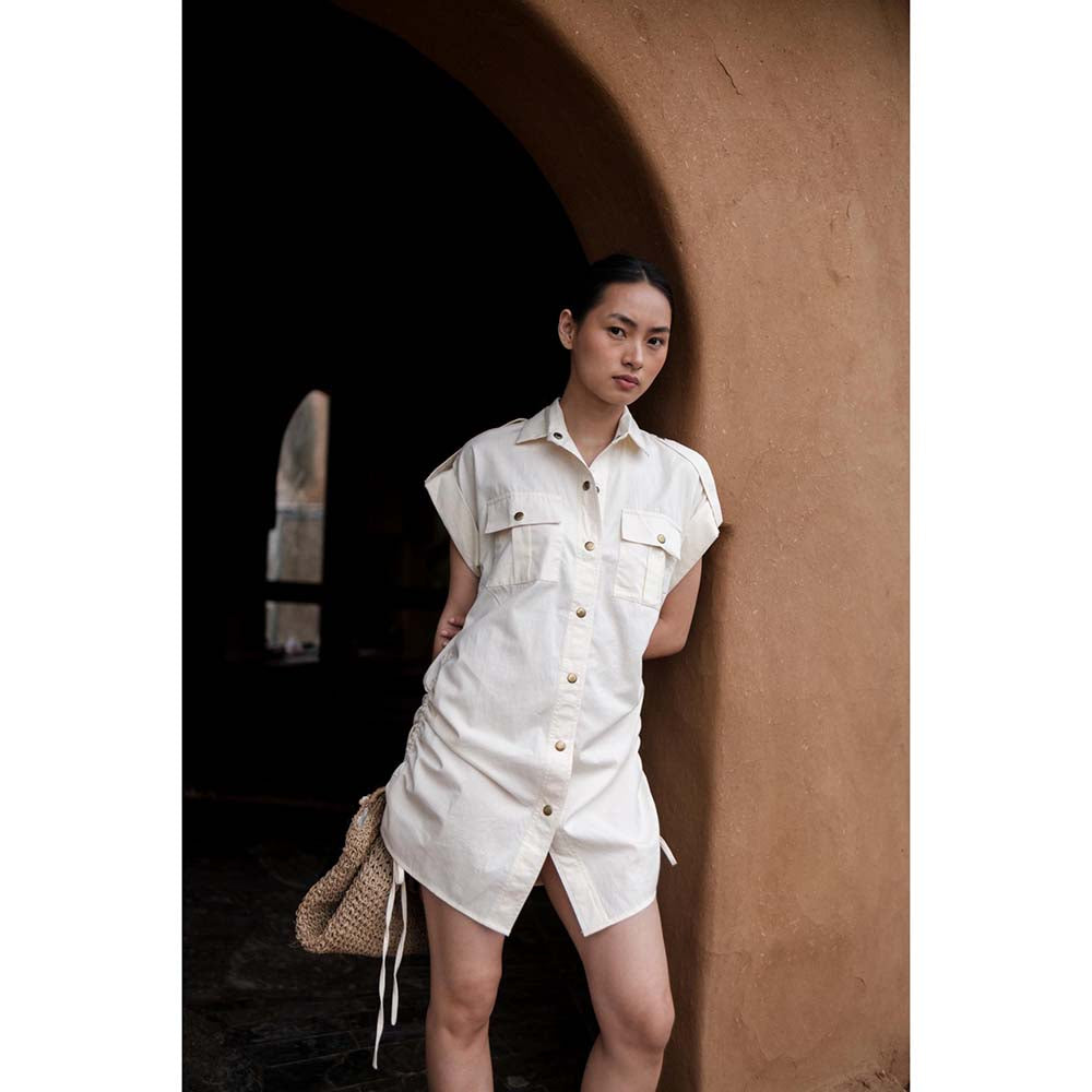 Description : This versatile shirt can be worn as a shirt and as a dress. The side gathers lends an air of sophistication, while the inclusion of patch pockets infuses a street-inspired essence, achieving a harmonious balance of style and comfort.