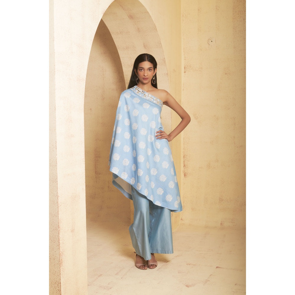 THETAA Womens Blue Mirror Work Off Shoulder Kurti and Palazzo
