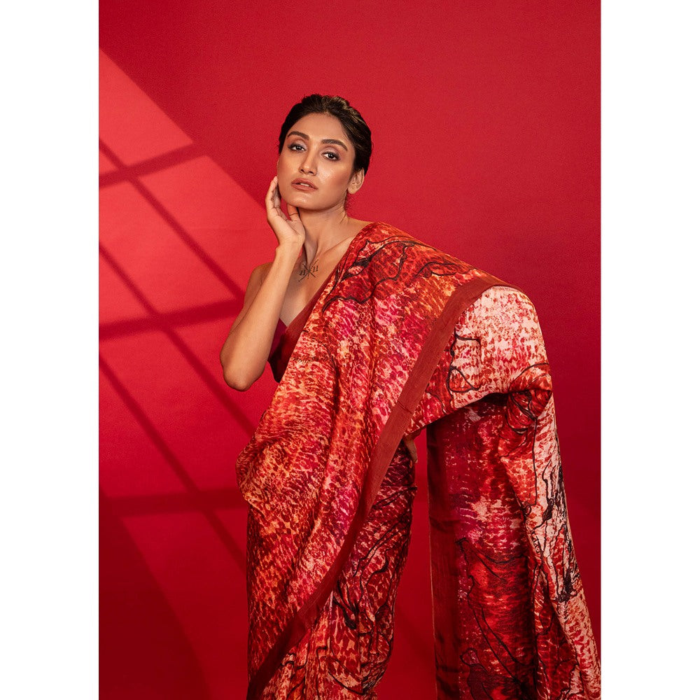 UNALLUME BY NISHA Crimson Red Blossom Silk Saree with Unstitched Blouse