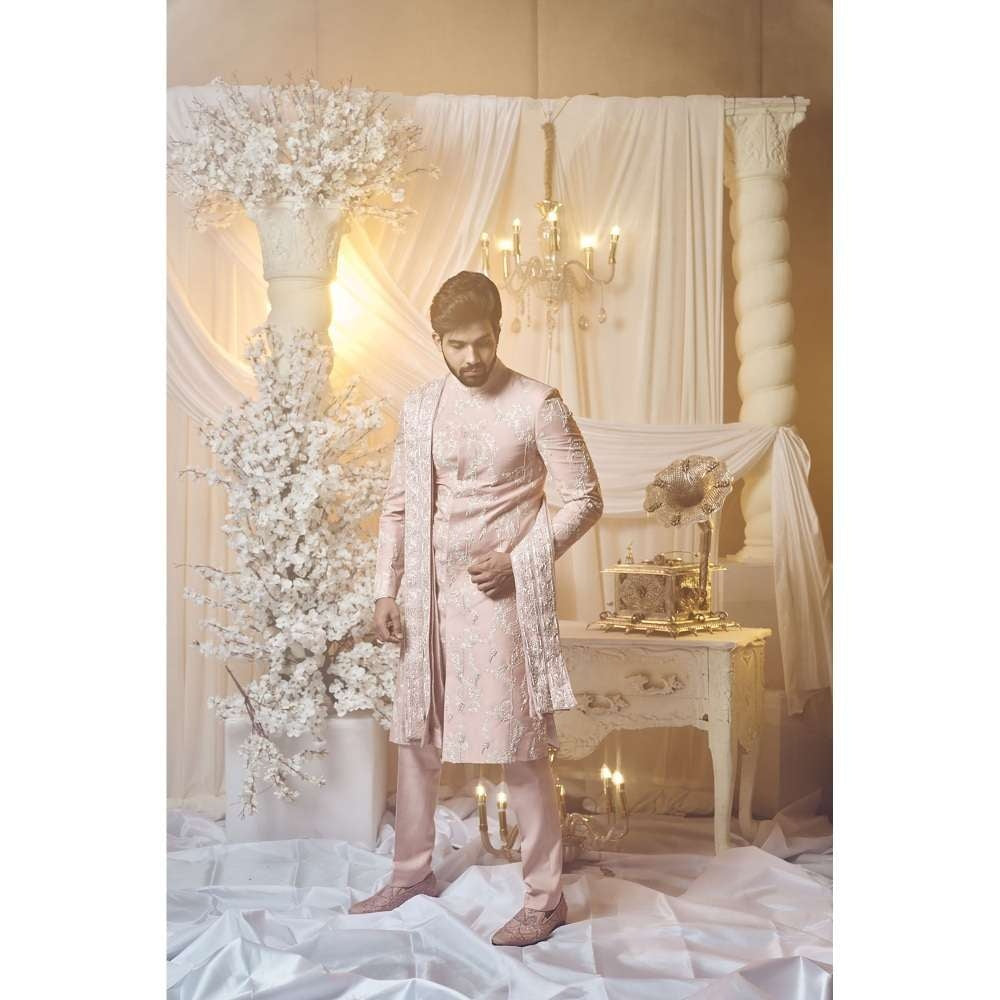 Description : Sea Shell Pink Carnation Sherwani Set Inspired By Baroque Style Of Decor Adorned With Thread, Glass Beads And Metallic Wire Work.