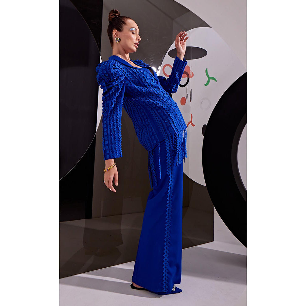 Description : All-Over Textured Jacket with Tone-On-Tone Geometric Applique and Fringe Details On Front and Back and Matching Wide-Leg Trousers with Pockets.