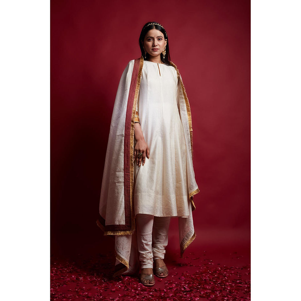 Vinusto Ivory and Gold Stripes Chanderi Anarkali Kurta with Pant with Dupatta (Set of 3)