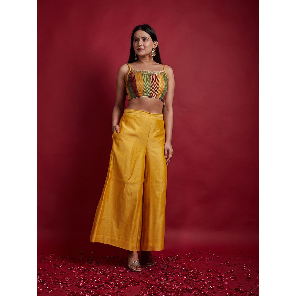 Description : Level Up Your Look With This Multi-Colour Crop Top & Palazzo Set From Vinusto. Crafted From Chanderi, It Is Finished With A Sleeveless Design And Shoulder Straps. Complete The Look With A Pair Of Heels And Exquisite Jewellery Pieces.