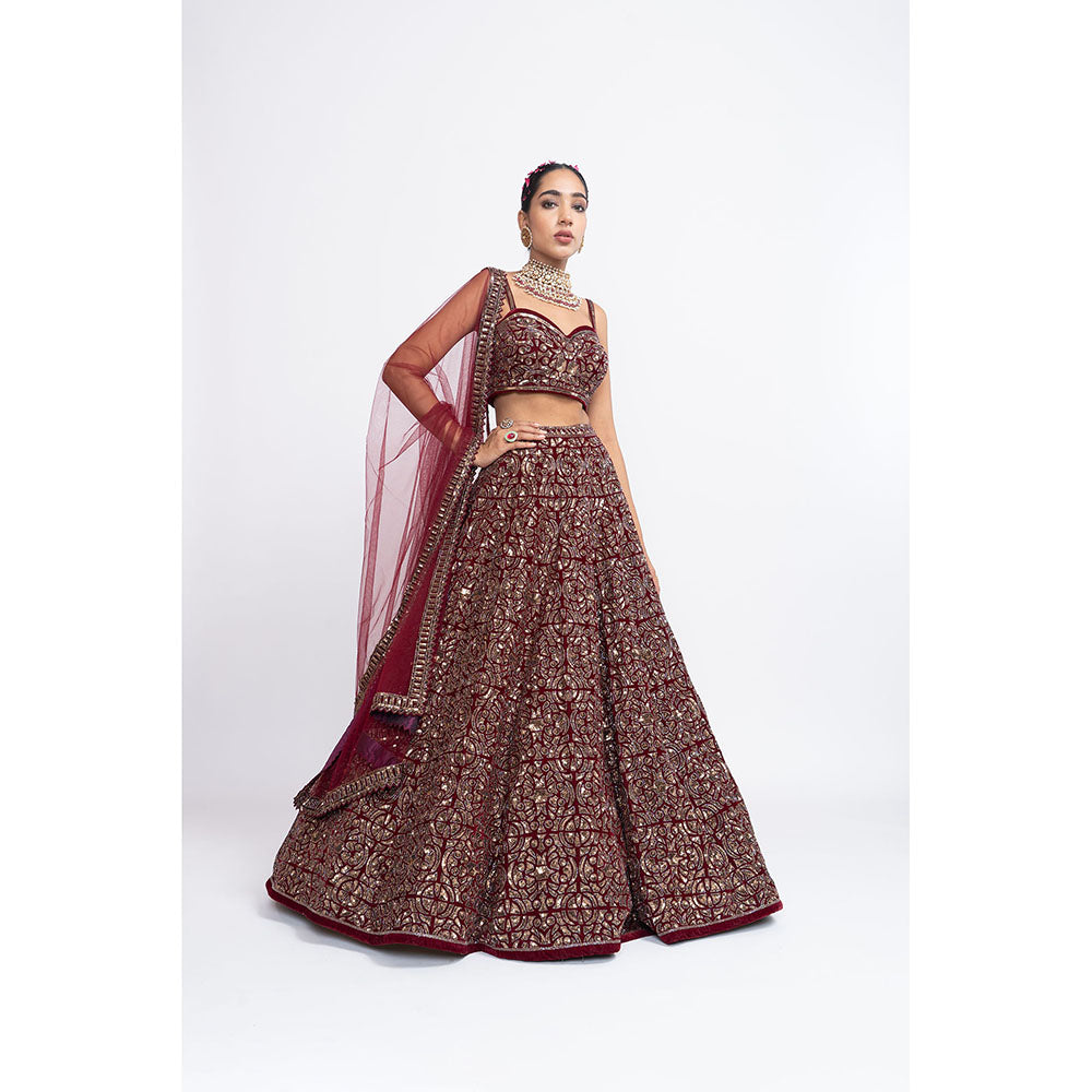 Vvani by Vani Vats Maroon Fully Embroidered Corset Blouse with Lehenga & Dupatta (Set of 3)