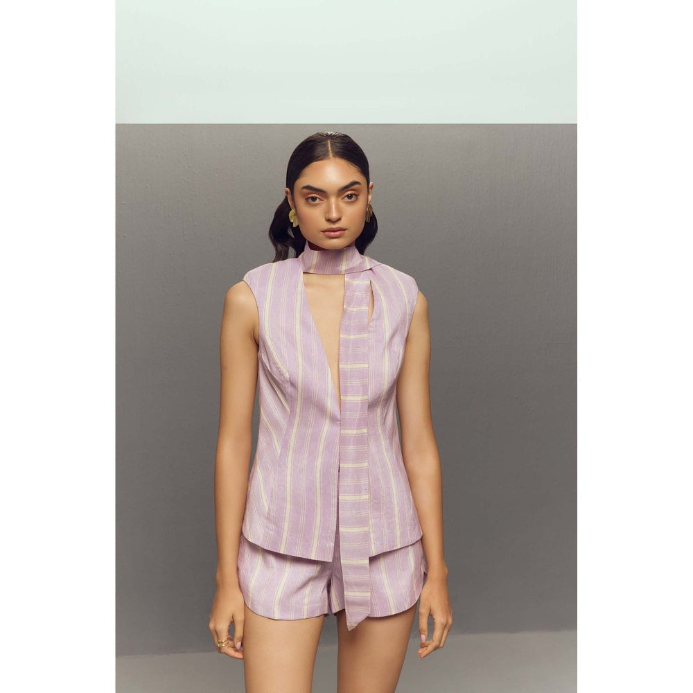 Description : Lend an effortless appeal to your style with this lavender top from Zaitra. Made from high quality silk, it features tie-ups closure and stripes pattern along with sleeveless & tie up neck design. Pair it with shoes or loafers to complete your ensemble.