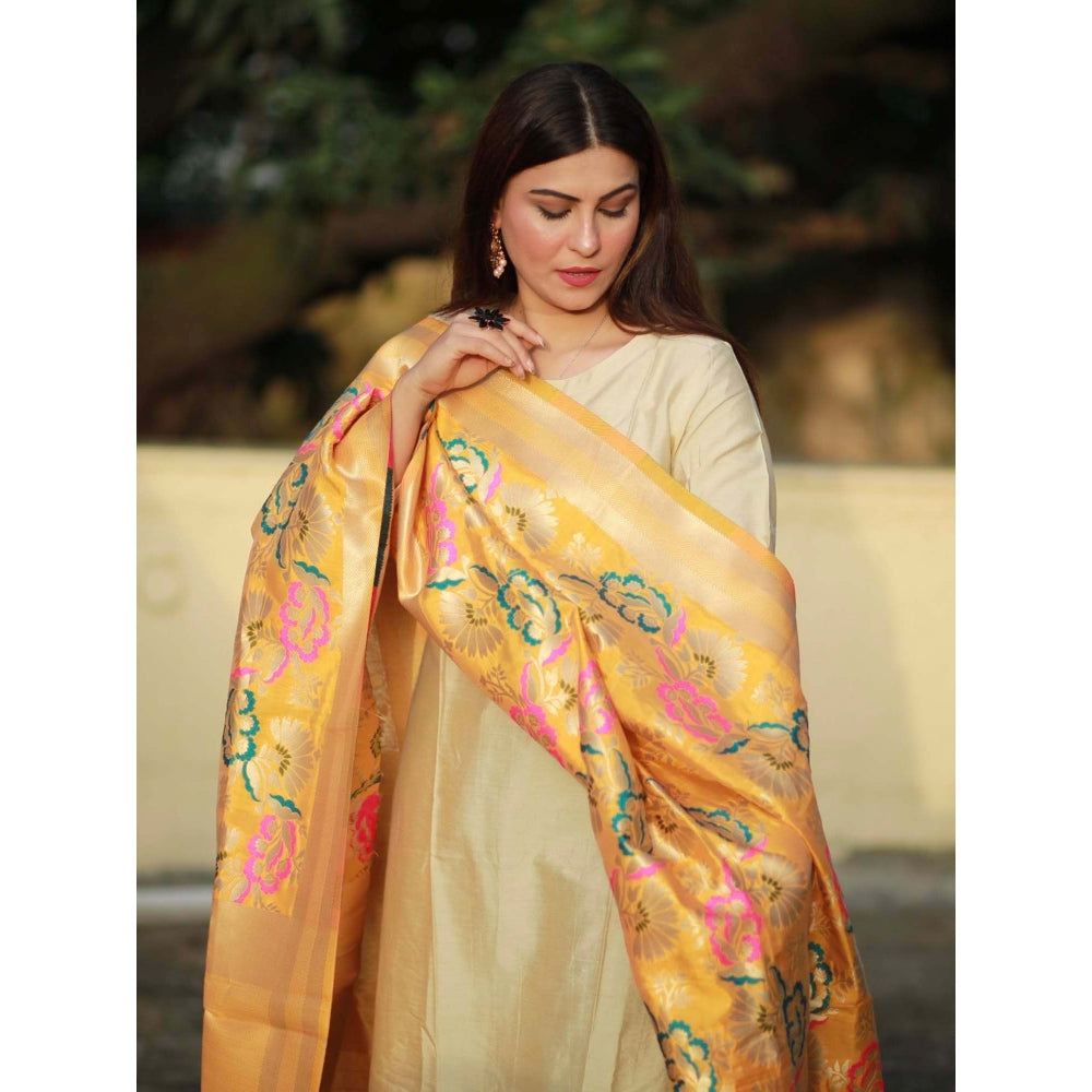 Yellow Pure Silk Banarasi Handloom Dupatta