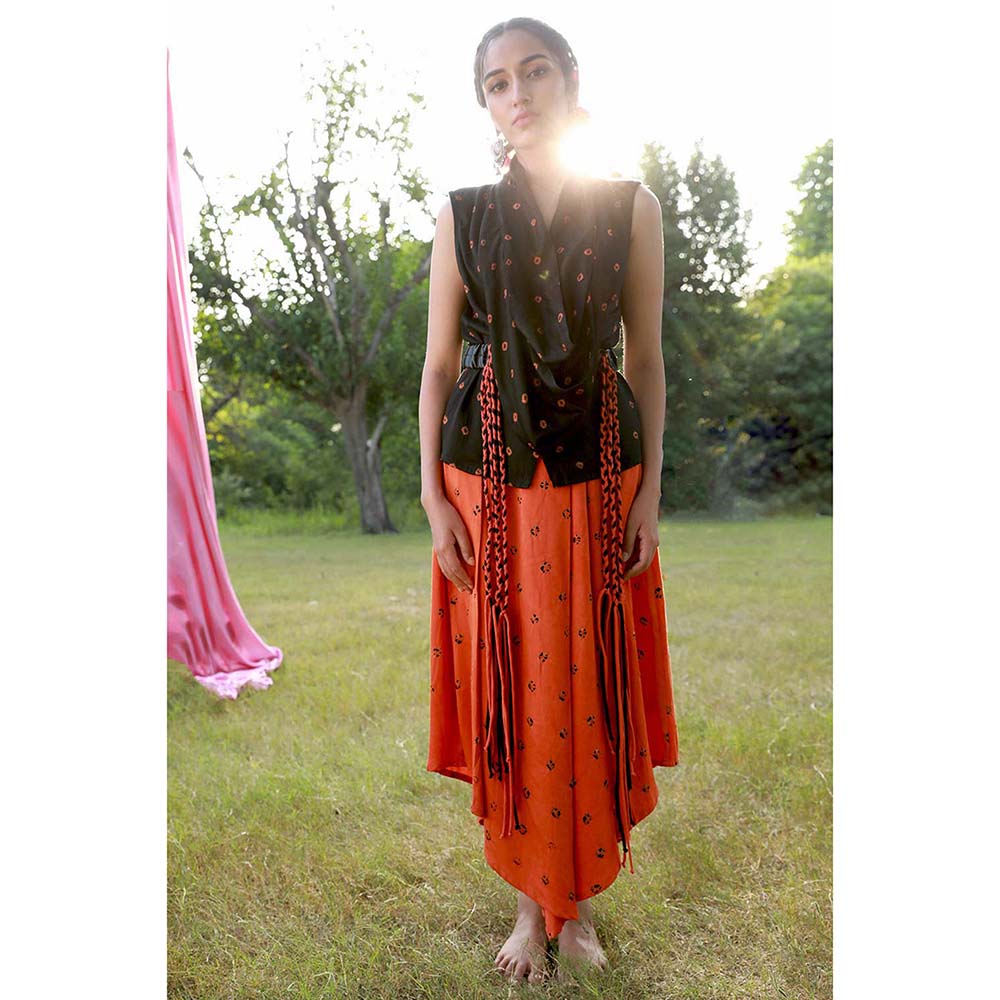 Description : Our asymmetric pleated skirt in beautiful hand tie and dye Bandhej, is a statement making piece. Paired with this beautiful black hand tie and dye bandhej shirt in soft cotton satin with extended collar, can be worn with the collar open as a drape with a belt for a fun boho look or it can also be tied up in a bow for a more sophisticated look. Take it to the weekend with black flats.