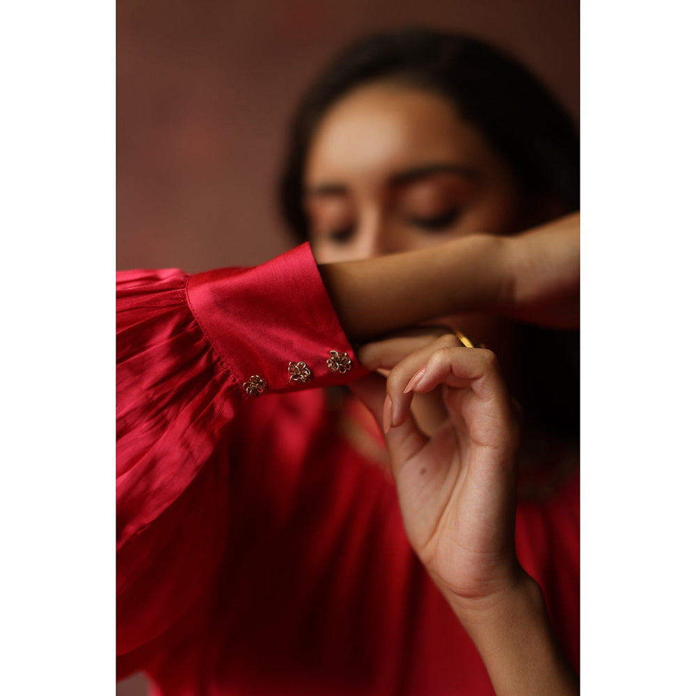 Description : The satin co-Ord set is a festive staple, with gatherings around the yoke and the sleeves which are adorned with hand embroidered detailing's. The neck is embellished with an intricate embroidered bel across the front and back. The set is finished off with broad sequin embroidery at the bottom and front slit.