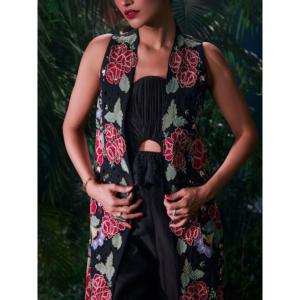 CHANDRIMA Black Cotton Floral Sleeveless Bead Work Jacket