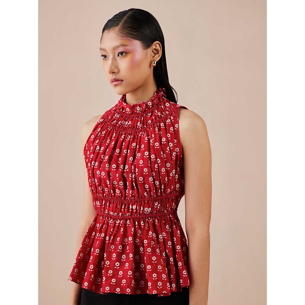 CHANDRIMA Red Block Print Ruched Top