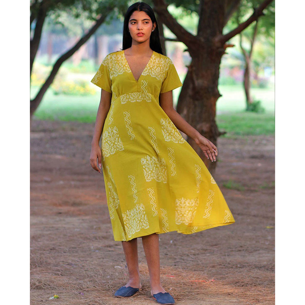 Description : A summer evening in a yellow dress is a good idea. don our easy, v-neck, pure cotton dress and sieze your day in style.