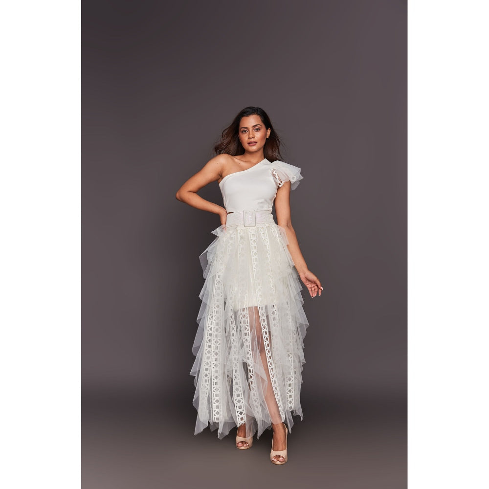 Deepika Arora White One Shoulder Ruffled Maxi Dress with belt (Set of 3)