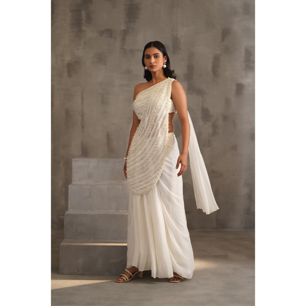 Deepika Chadha White Embroidered Pre-Drape Saree with Stitched Blouse