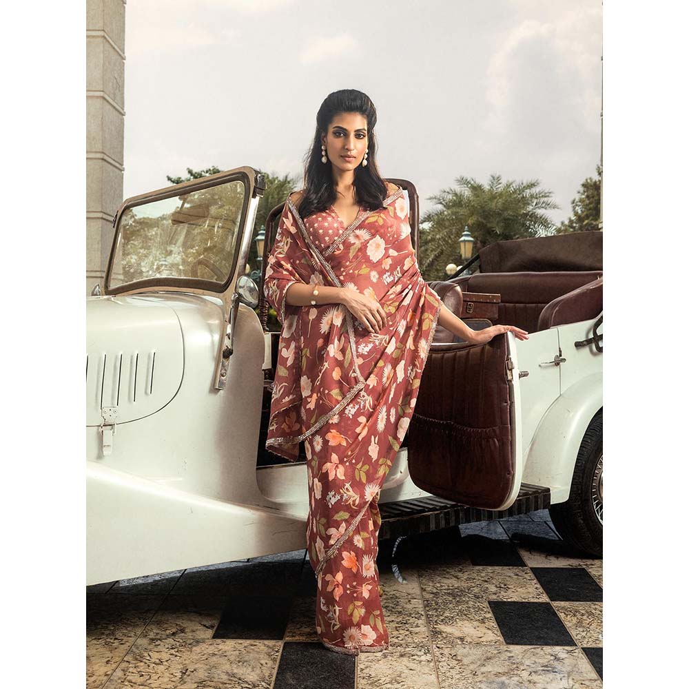 DOHR INDIA Anchal Brick Brown Floral Printed Organza Saree with Unstitched Blouse