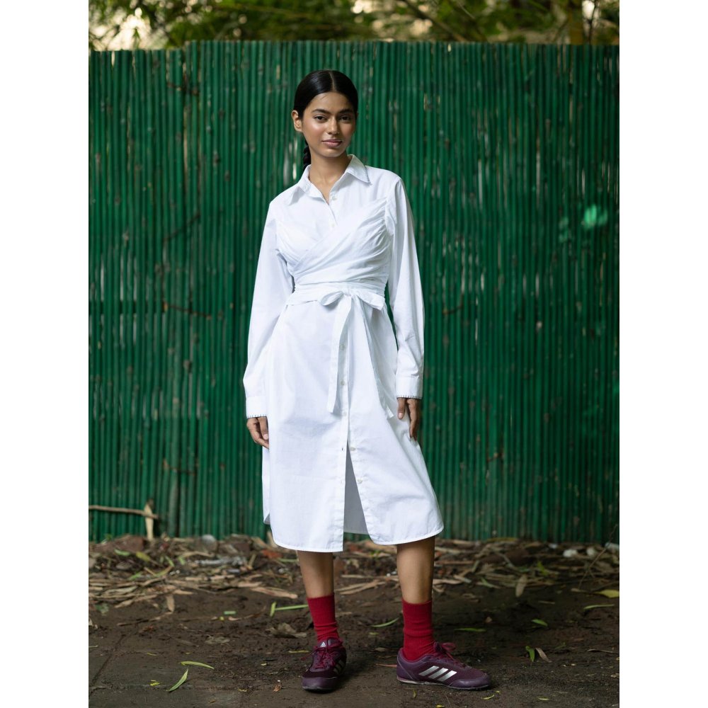 Description : Button Down Warp Shirt Dress With Button Hole Stitch Hand Embroidery Around Cuff And Collar To Uplift The Piece.