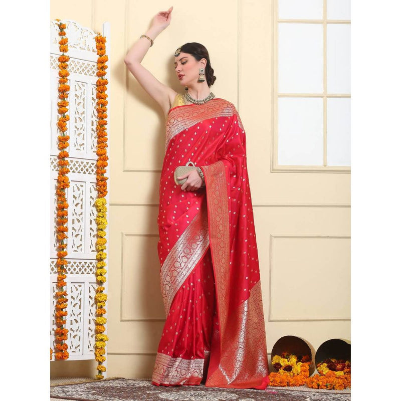 Dress & Dazzle Ruby Red Banarasi Katan Silk Saree with Unstitched Blouse