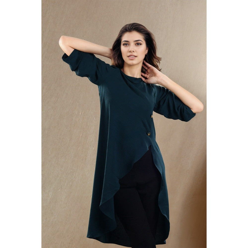 Description : Our Peacock Angle Tunic Is A Stylish Top Crafted From Luxurious Crepe. Its Asymmetrical Hem And Detailed Sleeves Make It The Perfect Choice For Evening Wear.