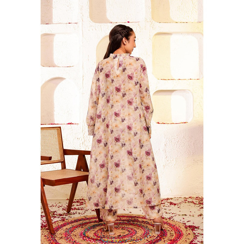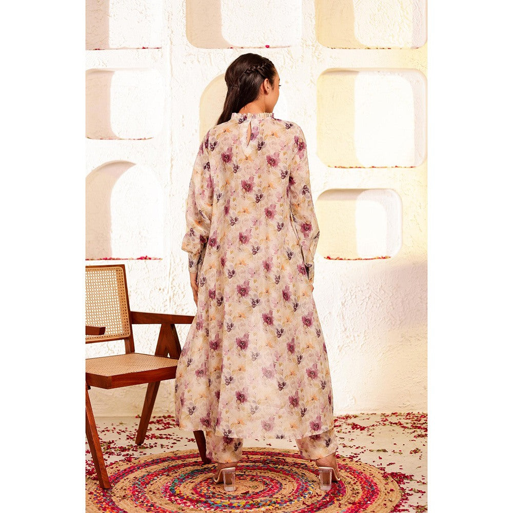 Description : Beige Mul Chanderi Printed Loose Fitted Kurta with Fitted Ruffle Neckline and Full Length Cuff Sleeves Along with Mul Chanderi Printed Pants
