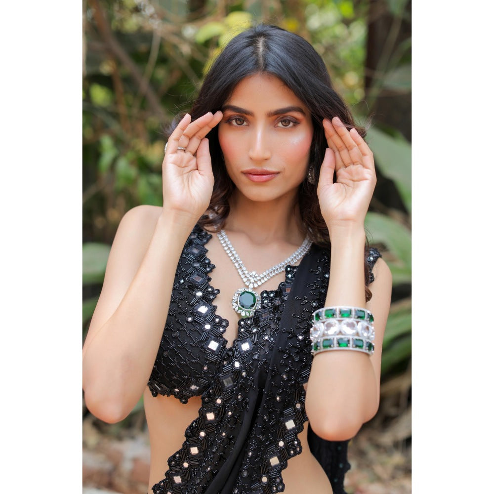 Black Embroidered Mumtaz Pre-Drape Saree with Stitched Blouse