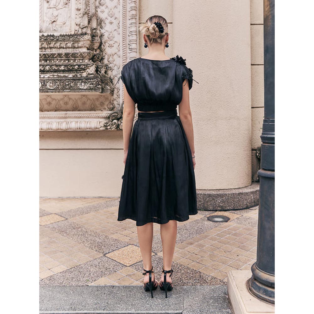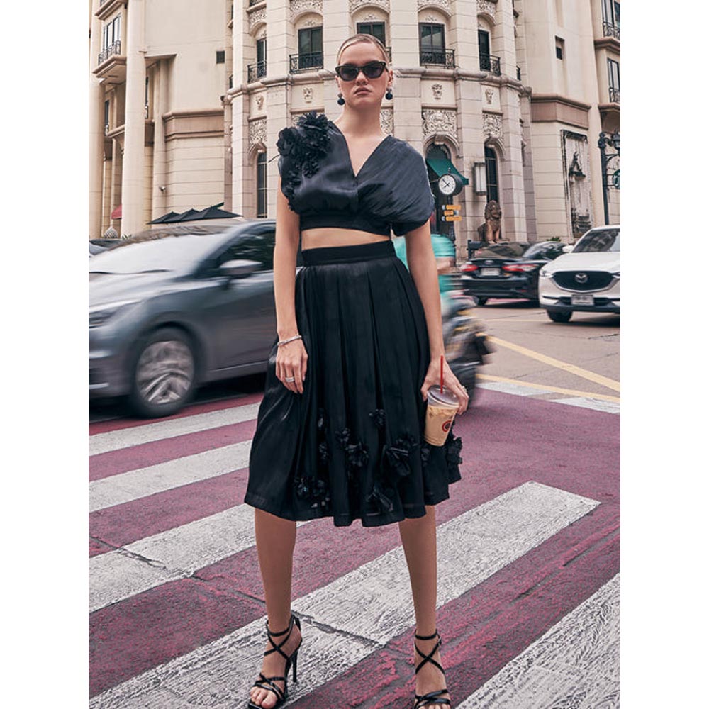 Description : The Chic Blake Crop Top Features Elegant Dolman Sleeves Adorned With Bows At The Shoulders That Provide A Relaxed Yet Sophisticated Silhouette. The Flattering V Neckline Adds A Touch Of Allure, While Vibrant Appliques Flowers Adorn The Right Side Of The Bodice, Offering A Striking Contrast To The Fabric's Shiny Black Finish. Pair The Crop Top With Blake Organza Skirt To Complete The Perfect Evening Outfit Of The Season.