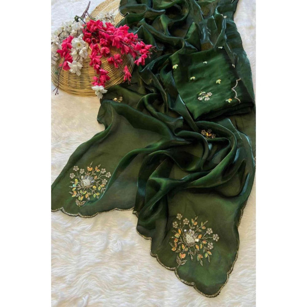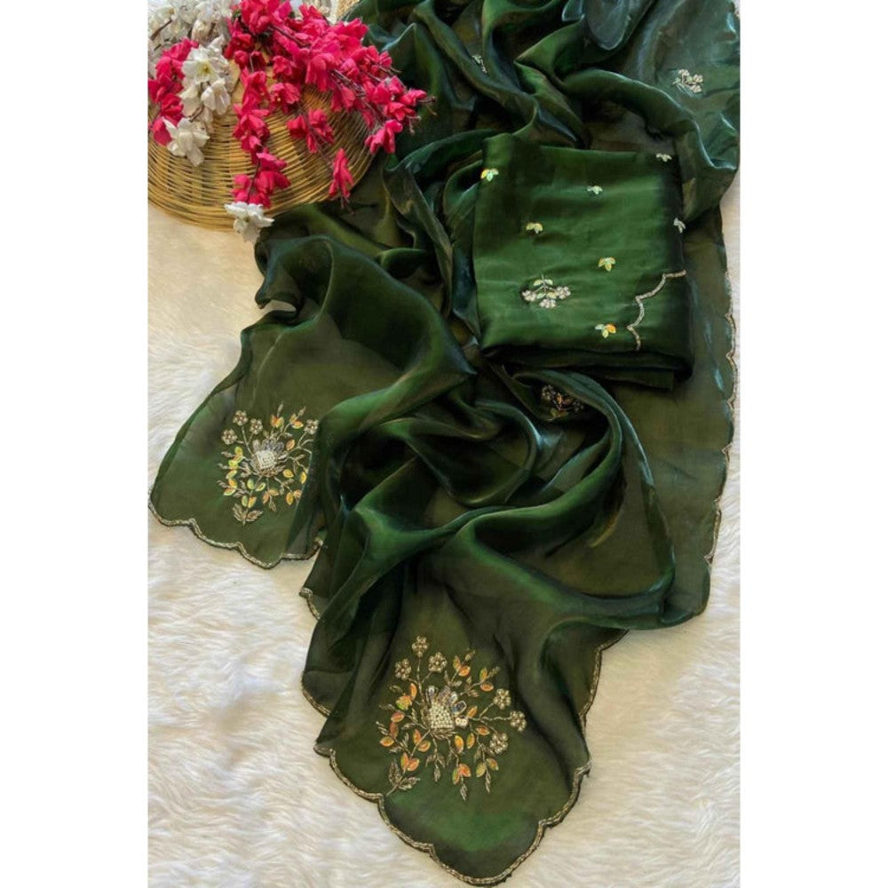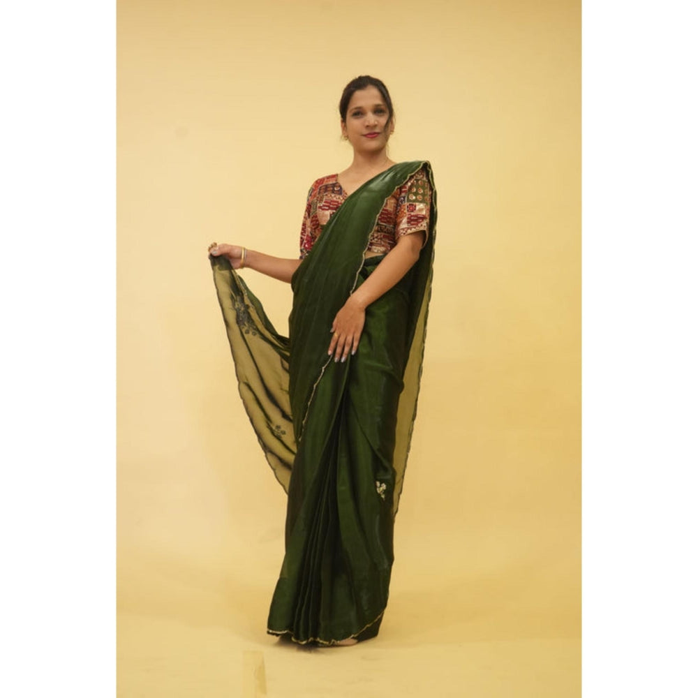 Womens Embroidered Sequined Green Pre-Draped Saree With Unstitched Blouse