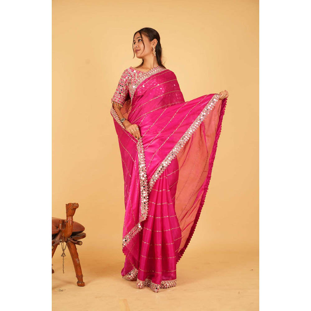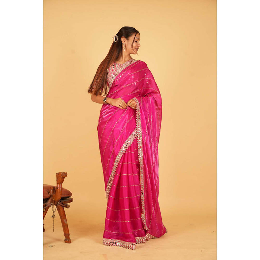 Womens Sequined Mirror Work Pink Pre-Draped Saree With Unstitched Blouse
