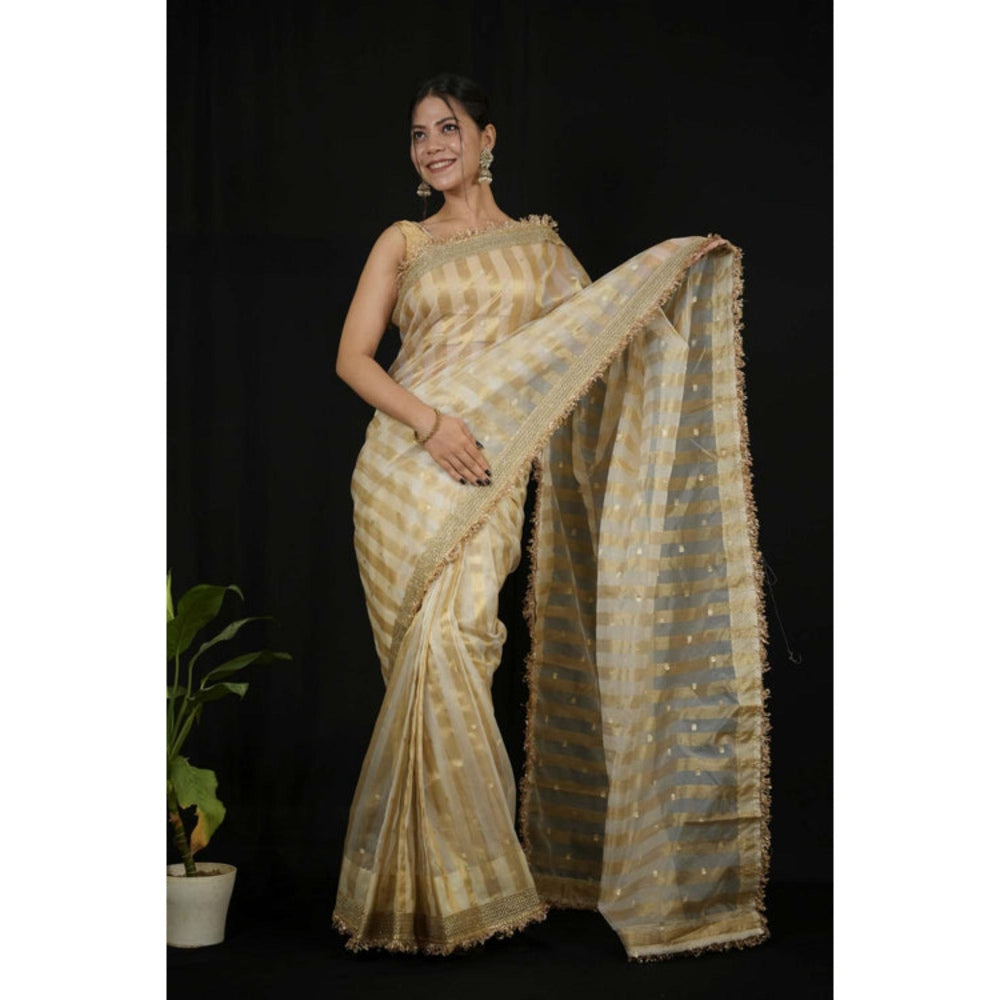 Isadora Life Womens Stripes Embroidered Ivory Pre-Draped Saree With Unstitched Blouse