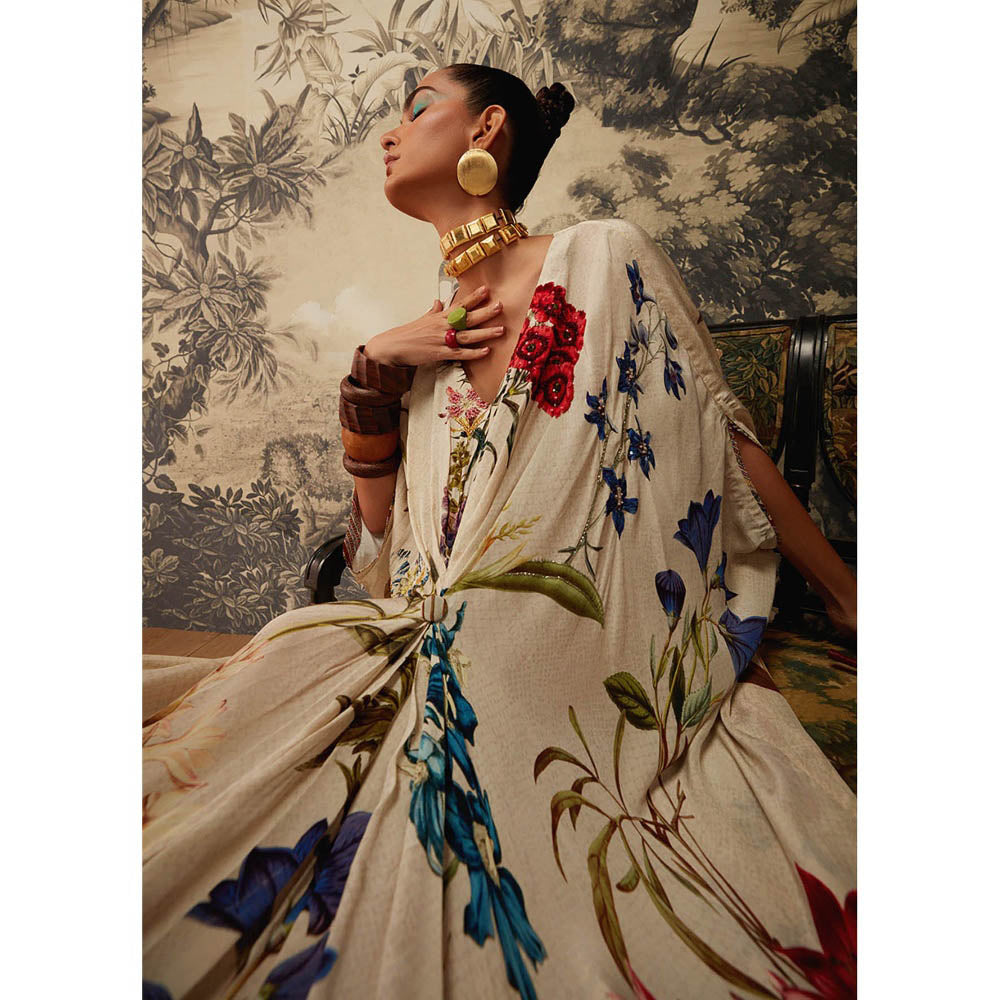 Description : Featuring A Printed Kaftan with A V Neckline. It Has An Intricately Handcrafted Beadwork On The Botanical Motifs