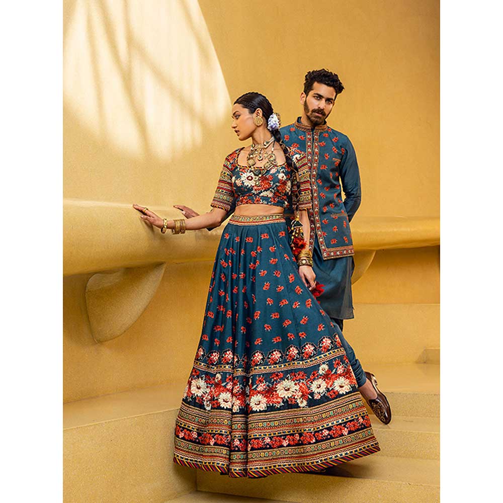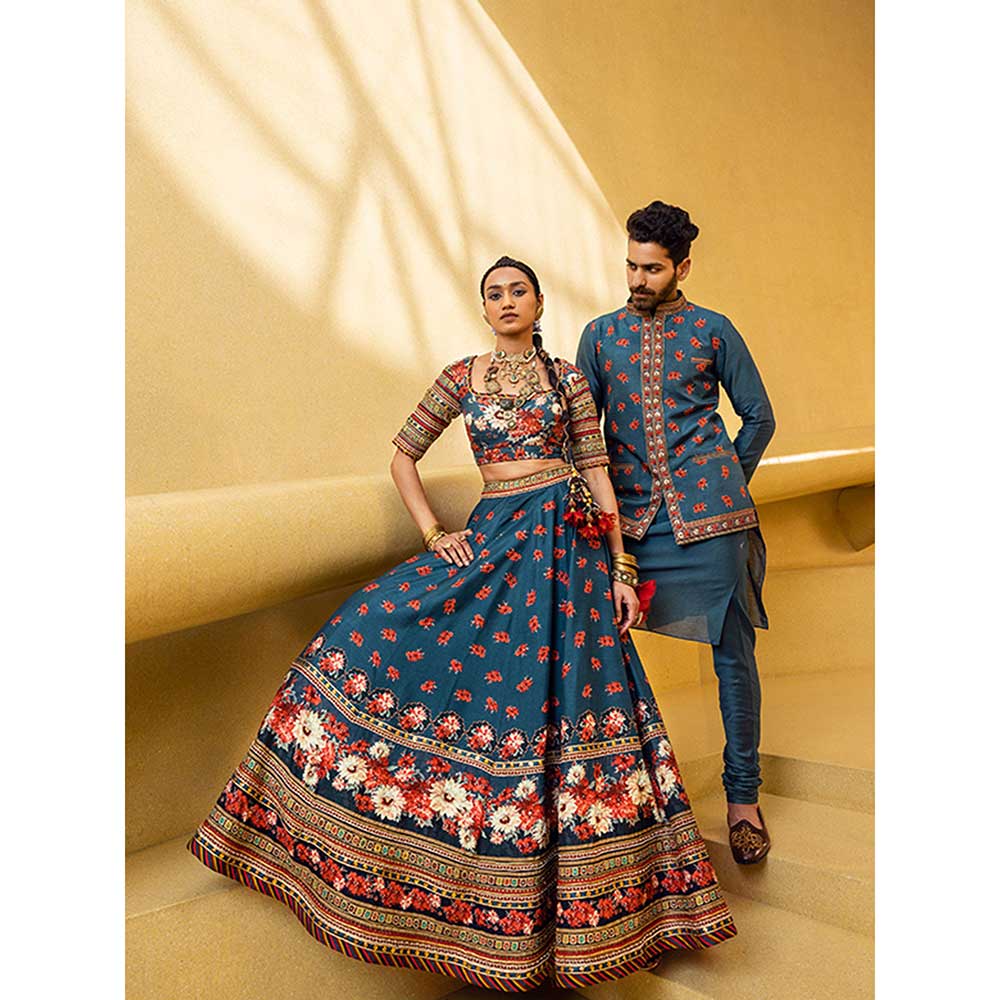 Description : Featuring a festive bandi with floral print running along the silhouette & textured badla work, comes with plain kurta and churidar. Perfect outfit for that effortlessly elegant classic look.
