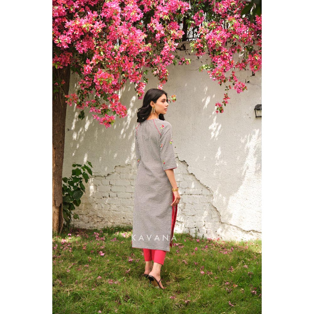 Cherry blossom cotton kurta set - a timeless blend of charm and craftsmanship. A classic gingham straight-cut kurta, crafted from pure cotton, showcases intricate hand-embroidered cherry motifs in vibrant red and green, delicately stitched with resham and anchor threads on the front and sleeves. The closed neckline is accentuated with contrast red piping, adding a refined touch.