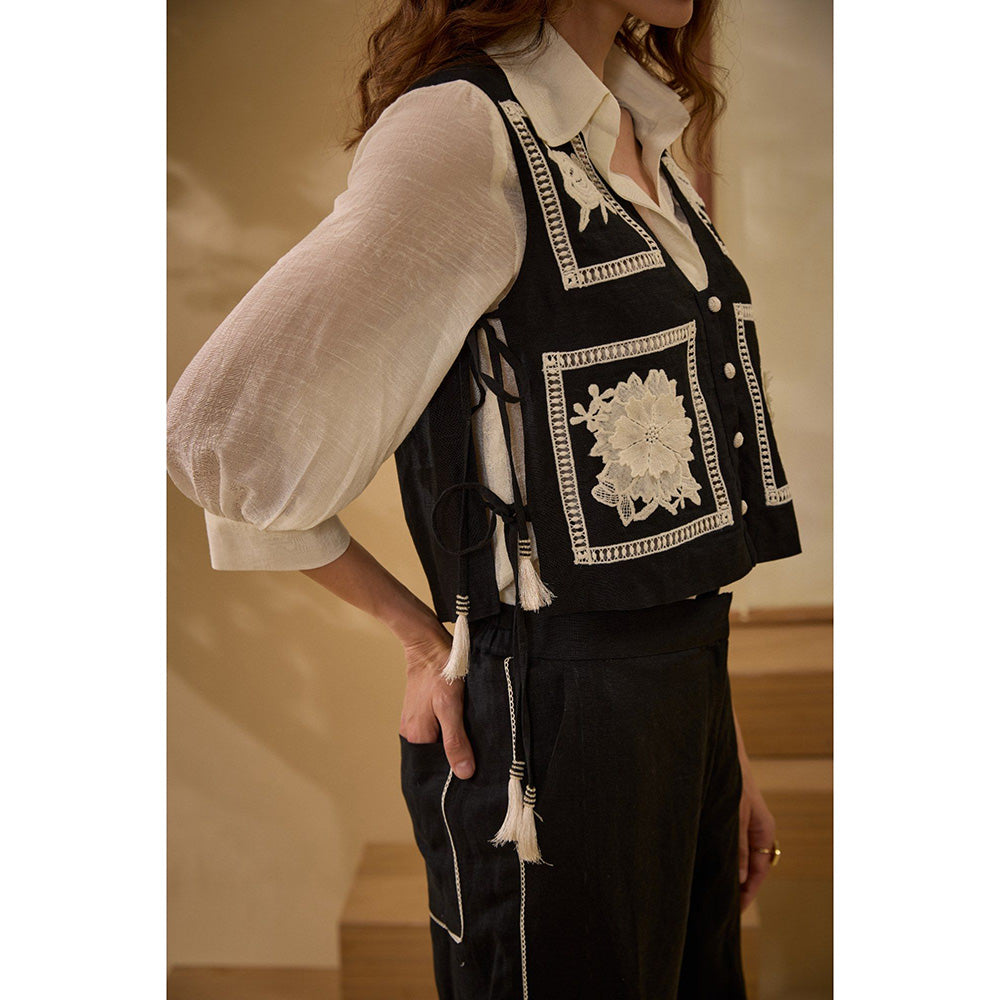 Description : Vest :Cropped Embroidered Vest boxy Fit side & Front Open tassels & Ties On The Side macram Buttons shirt :Shirt In Linen Crepe front Open concealed Placket pants :Pants elasticated Waistband At The Back front Opening delicate Lace Highlights fabric :Soft Cotton Linen