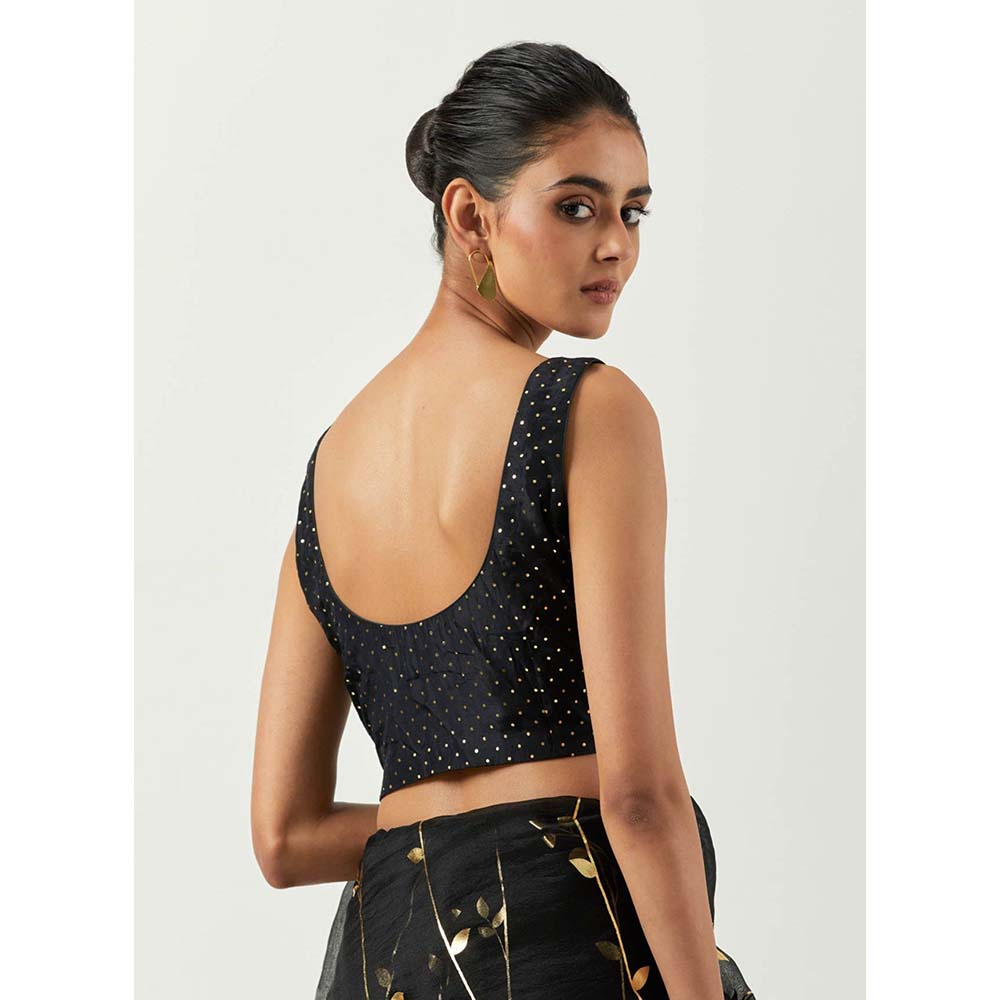 Description : To look beautiful this wedding season, grab this lovely black saree blouse set. It is crafted from premium quality. It features printed pattern with sleeveless, round neck style. Pair it with matching jewellery and heels for the gorgeous look.