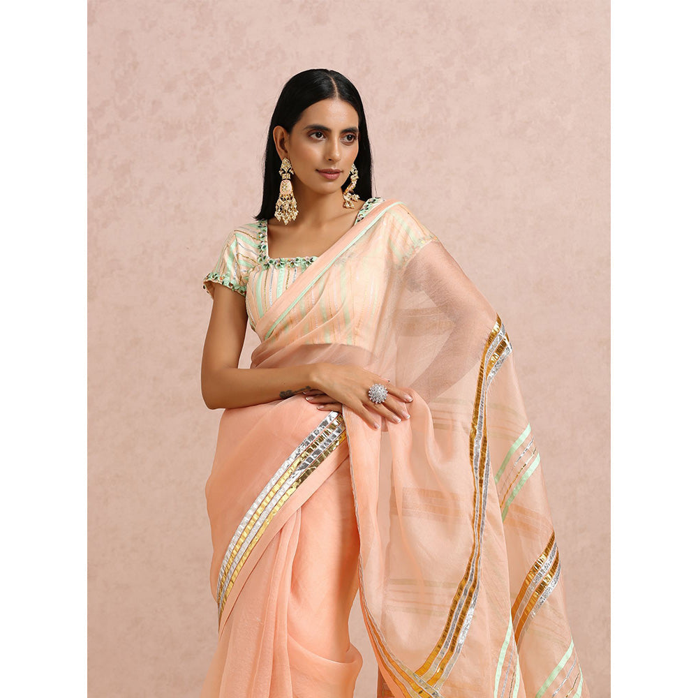 Description : Featuring a peach silk organza saree with gota placements and contrast fabric stripes all over. It is paired with a peach blouse having gota and hand embroidery.
