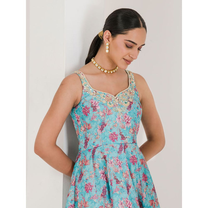 Maive Blue Print Embroidered Anarkali with Pant and Dupatta (Set of 3)