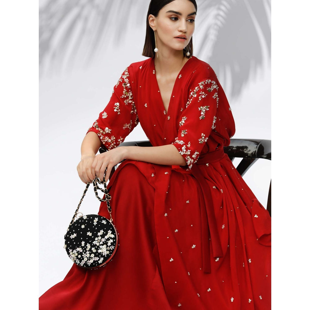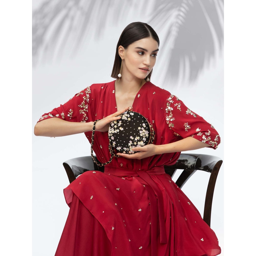 Description : Elevate your outfit with this black hand embroidered clutch from Mandira Wirk. It is a great pick for parties and will keep all your essentials secure without the fuss of carrying a bigger bag. Pair it with a dress to complete the look.