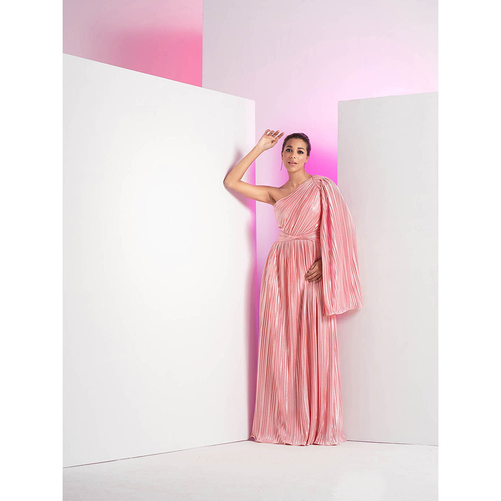 MANDIRA WIRK Flamingo Pink One Side Shoulder Heat Self Design Maxi Dress