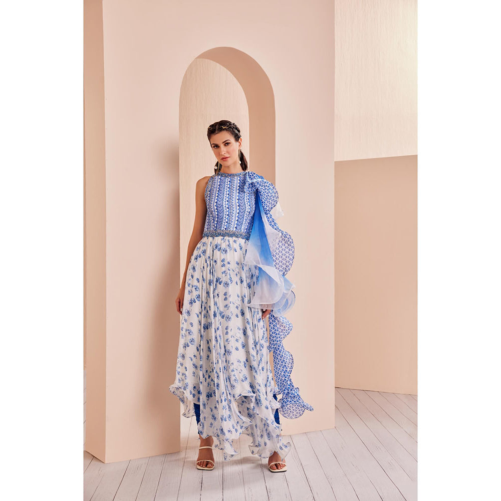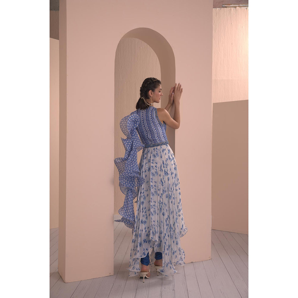 Description : Indulge in the artistry of this ensemble, where meticulous craftsmanship meets contemporary design. The outfit boasts heavy embroidered borders, showcasing intricate detailing that adds opulence and charm. The chiffon bodice features delicate tonal embroidery, creating a harmonious blend of elegance and modern aesthetics. Attached to it is an asymmetric wired pico kurta, offering a dynamic silhouette and a sense of fluidity. Paired with the kurta is a modal satin churidar, ensuring both comfort and style. Adding to the ensemble's allure is an additional ombre printed organza layer, providing depth and texture to the overall look. To complete the outfit, a chiffon printed cascade dupatta adds an elegant finishing touch, making this ensemble a captivating choice for any special occasion.