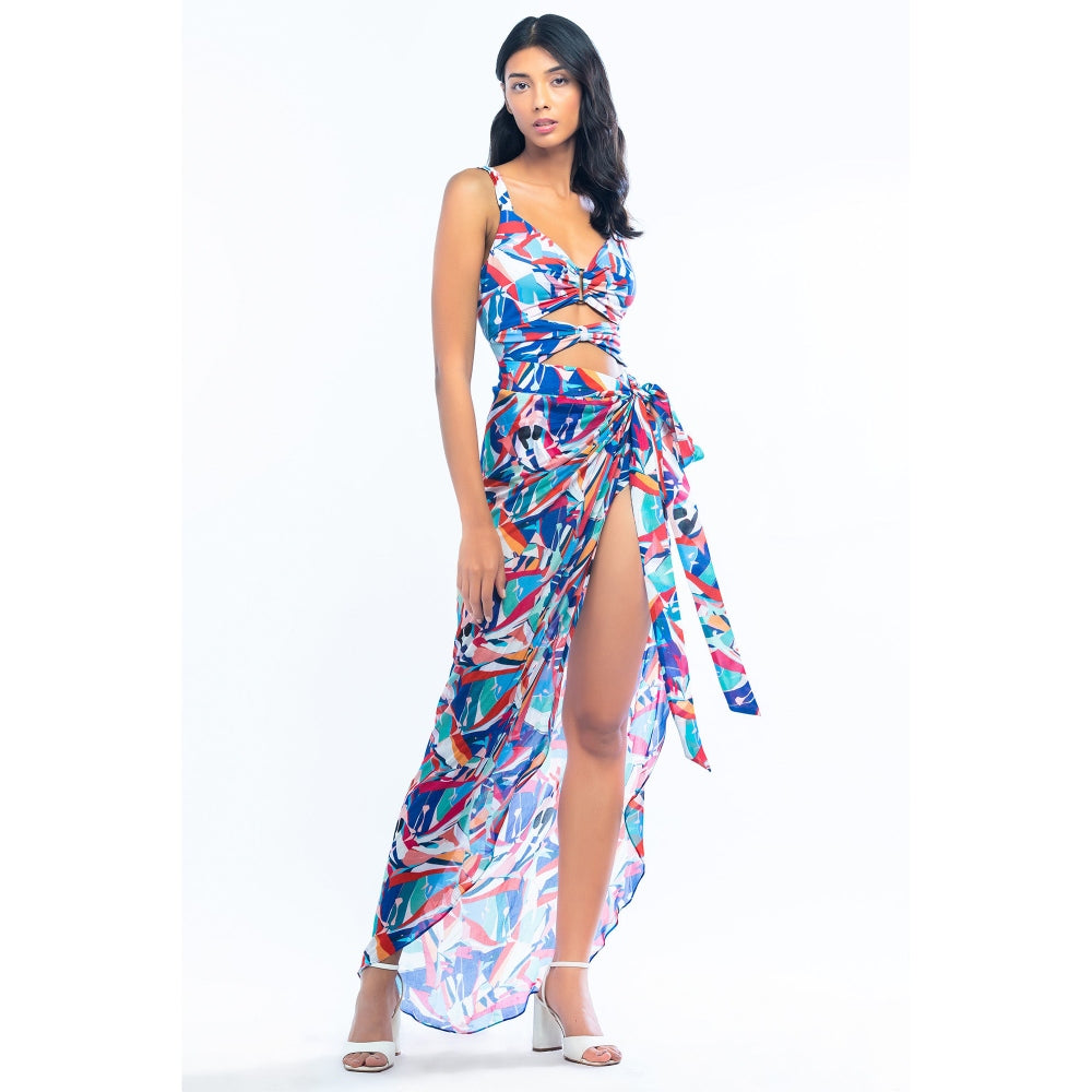 MANDIRA WIRK Lycra Printed Bodysuit with Chiffon Wrap Blue & Pink (Set of 2)