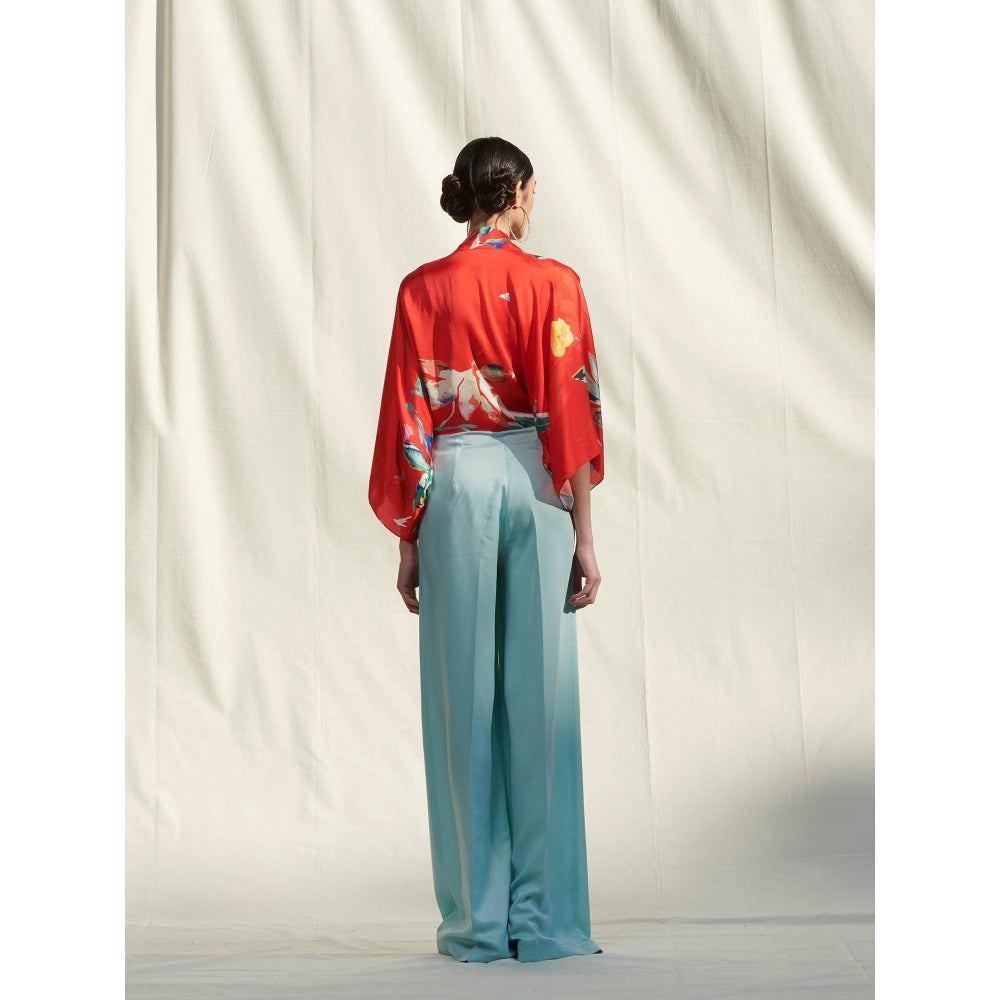 Description : Elevate your casual collection with this set from Mandira Wink. Crafted in crepe satin, this red printed kaftan top paired with a printed camisole and satin pants is what you need. Style it with heels and minimal jewelry to complete the look.