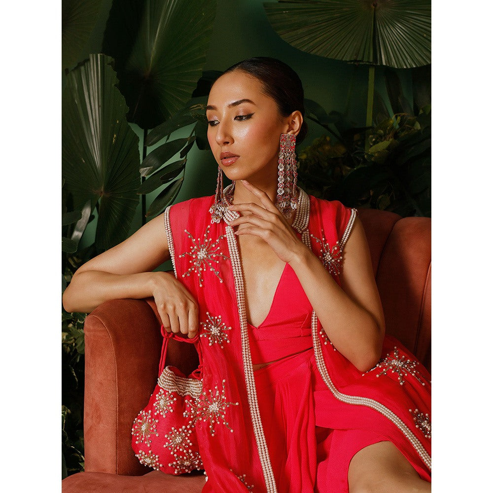 Description : Level Up Your Look With This Red Jacket Lehenga From Midushi Bajoria. Crafted From Cotton, It Is Finished With A Sleeveless Design And A Mandarin Neck. Complete The Look With A Pair Of Heels And Statement Jewellery.