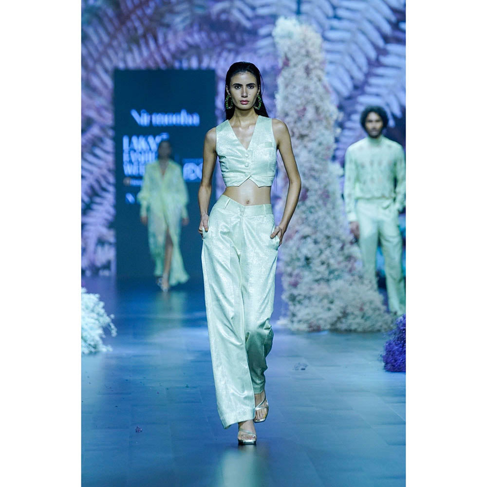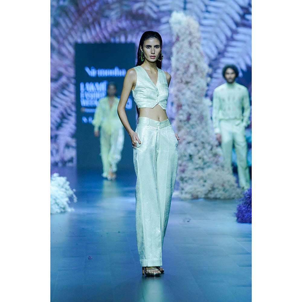 Nirmooha Cool Matcha Shimmer Crop Vest Coat with High Waist Straight Fit Pant (Set of 2)