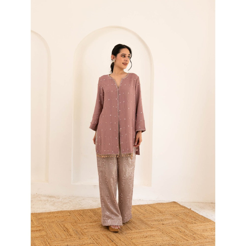 Description : The kurta set is in dusty pink georgette shirt with hand embroidery and tassels , pants in organza with hand work