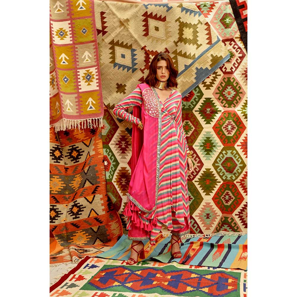 PALLAVI JAIPUR Hot Pink Indi-Leheriya Wrap Angarkha with Pant and Dupatta (Set of 3)