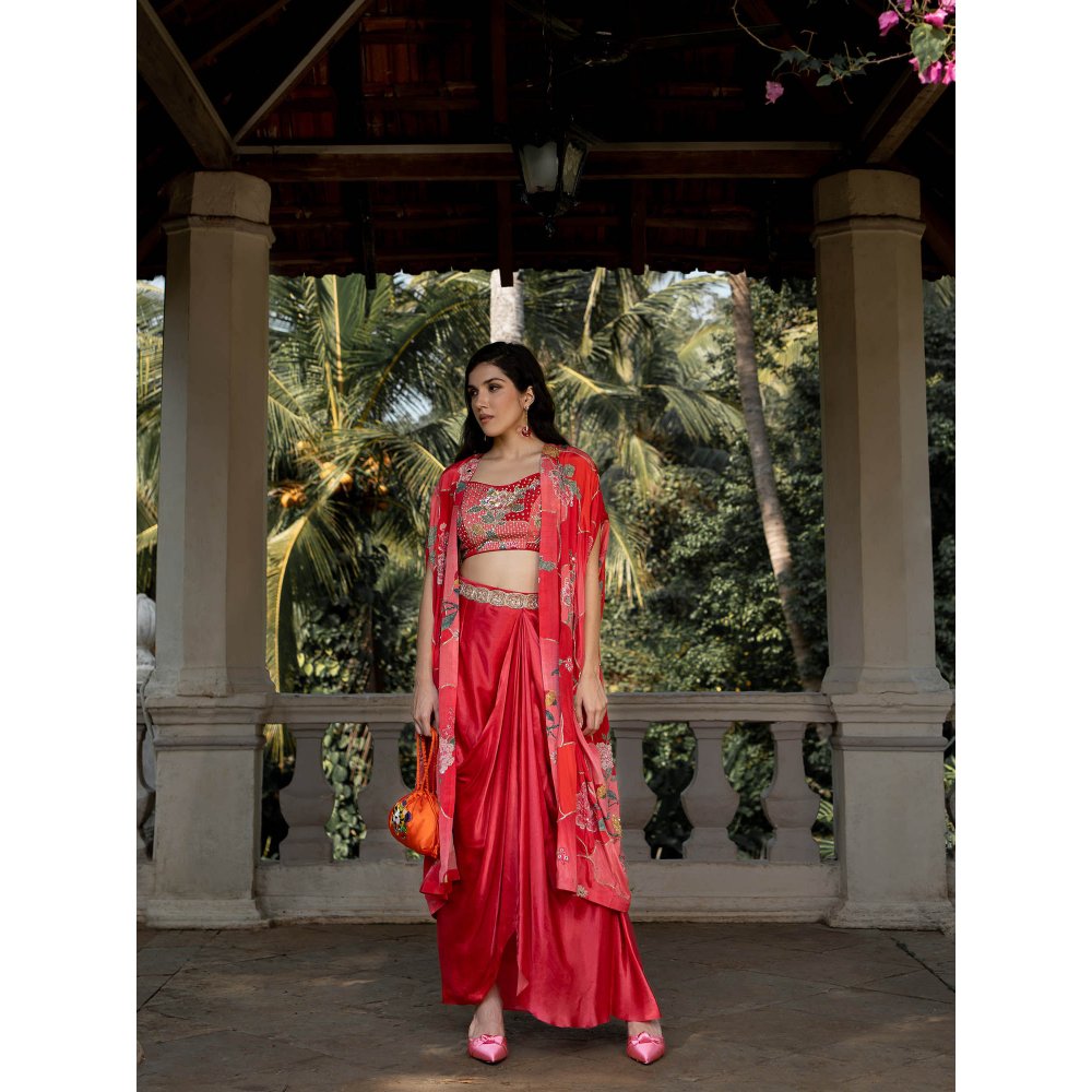 Description : A Cherry Red Color Palatte For Day And Nights Of Celebration.The Jacket Set Is Crafted In Our Signature Nasha Print And Tailored In Pure Fabrics, Blouse Is Adorned Using Heavy Hand Embroidery Techniques Using Different Materials Such As Mirrror, Resham Thread, Nakshi, Cutdana, Moti, Sequins. The Jacket Is Sprinkled Using Khatli Embroidery Technique And It Is Paired With Satin Pre Drape Skirt To Add Sheen In Your Celebration.It Is Paired With Cutdana Hand Embroidered Belt To Add Beauty To The Set.